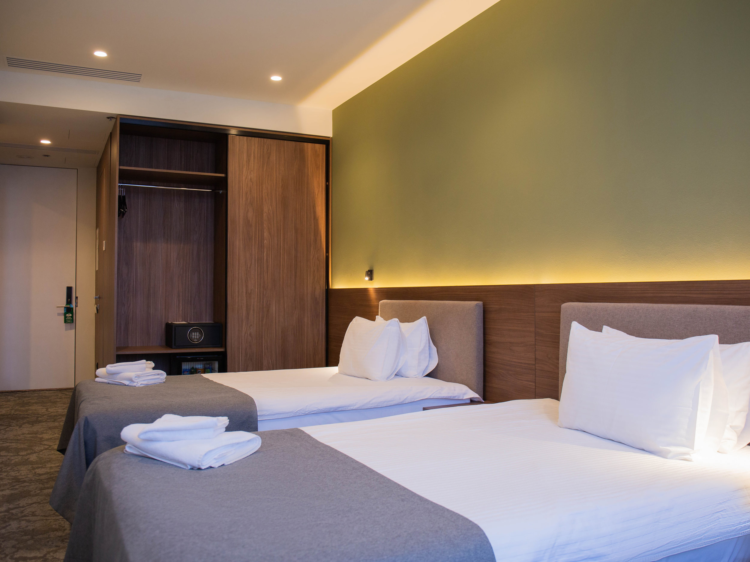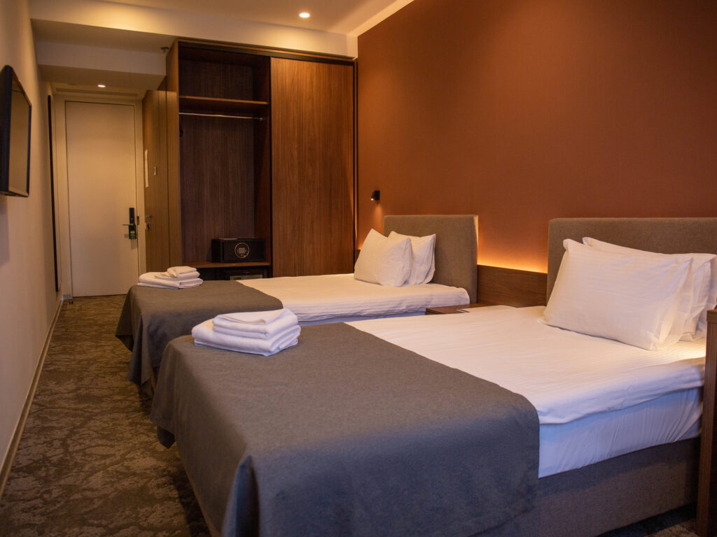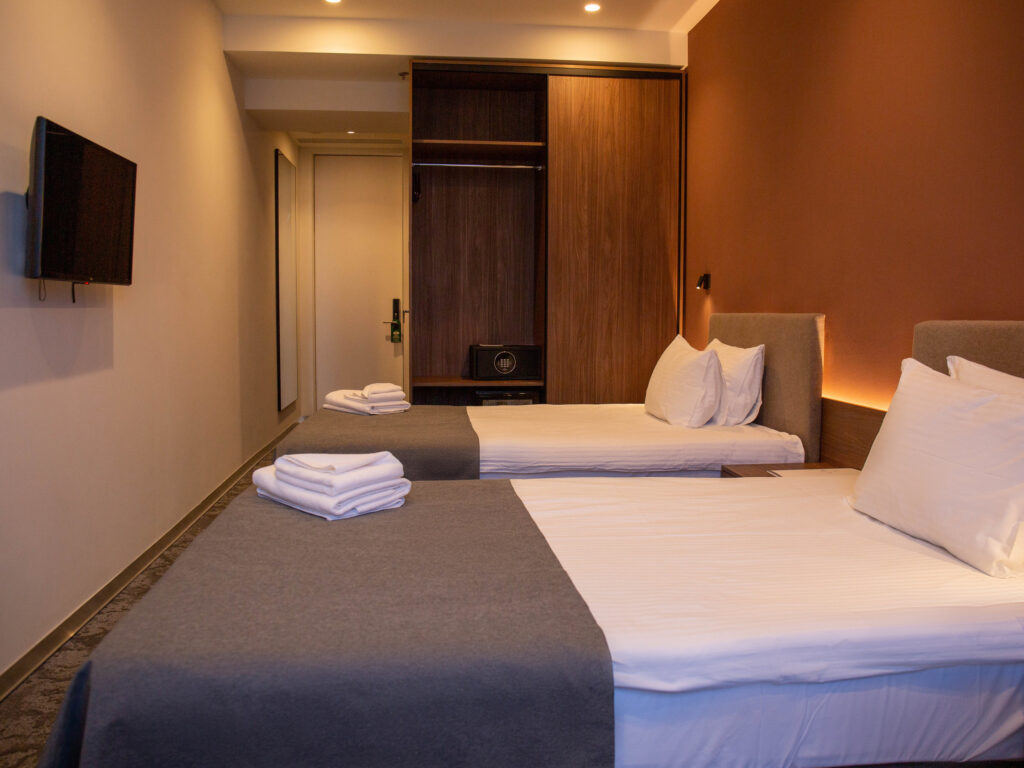 Затишний однокімнатний номер з двома окремими ліжками створений для гостей, які віддають перевагу лаконічності. Досить зручно розташовані меблі: приліжкові тумби, велика шафа з розсувними дверима, стіл, стілець. Є міні-бар, сейф, телевізор із сучасним кабельним телебаченням, та безкоштовний Wi-Fi Інтернет доступ. Санвузол оснащений душовою кабіною та необхідною сантехнікою, зручним дзеркалом, феном, комплектом рушників, набором міні-косметики. Також Ви знайдете кімнатні тапочки, вішалки для одягу, аксесуари для взуття. В номері працює система кондиціонування (клімат-контроль) та опалення, цілодобове водопостачання. Присутні москітні сітки на вікнах.